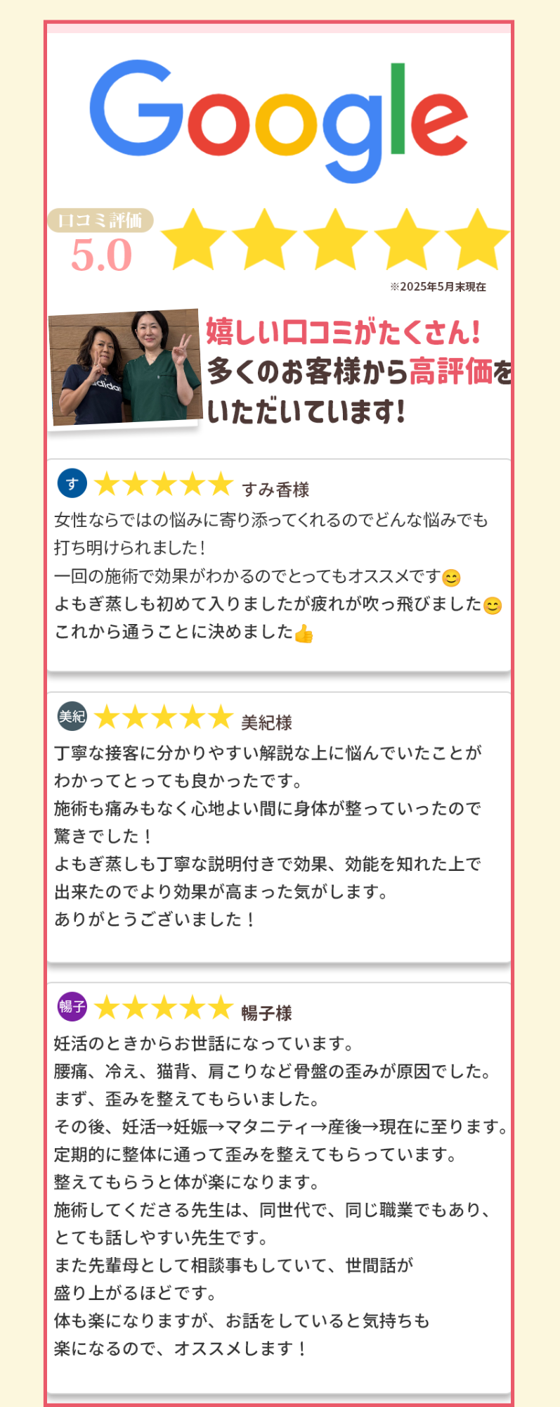 施術してくださる先生は、女性だしとても話しやすい環境です。