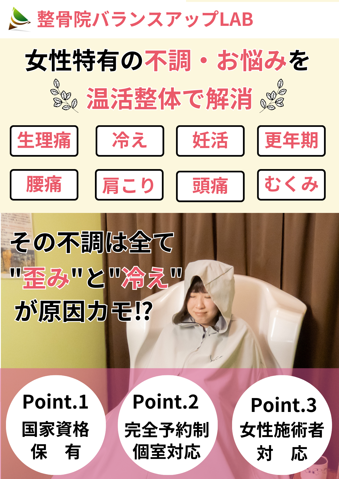 バランスアップLABでは、医療従事者としての知識と経験を活かし、女性の体を熟知したスタッフが、女性特有の歪みに対する不調にアプローチします。