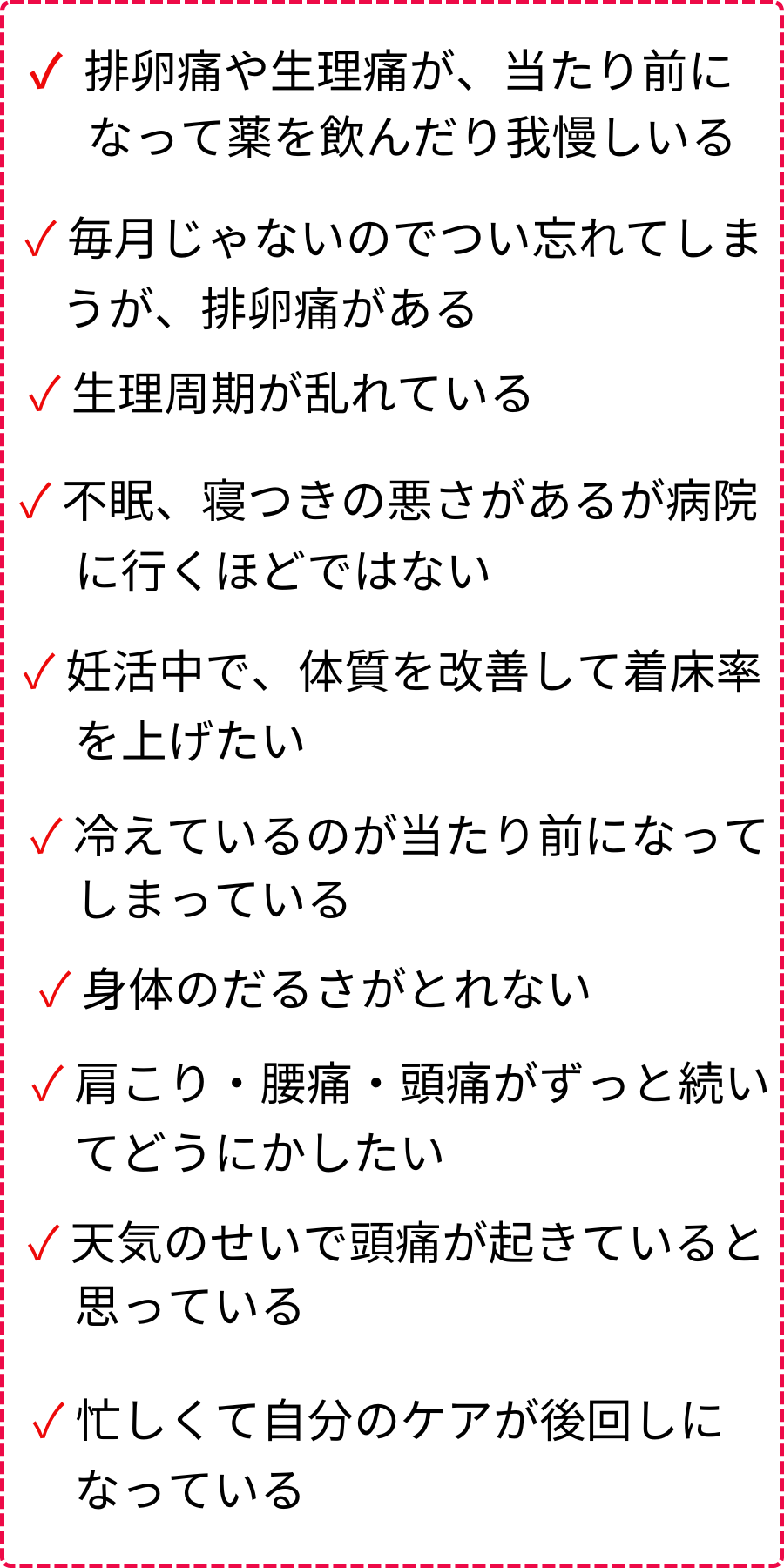 「なんとなく体がだるい」「寝ても疲れが取れない」「生理痛がつらい」「肩こりや頭痛が慢性的」……。