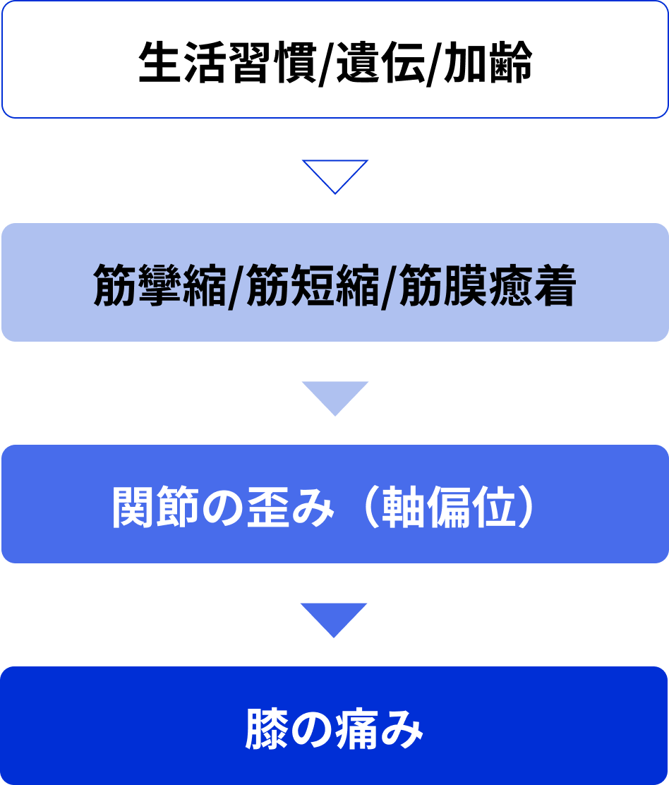 筋肉の異常は時間が経過すると関節の歪みを起こすので関節は正常の位置から逸脱した軌道で動くことになり関節周囲組織に負担がかかります。だから痛みが生じるのです。